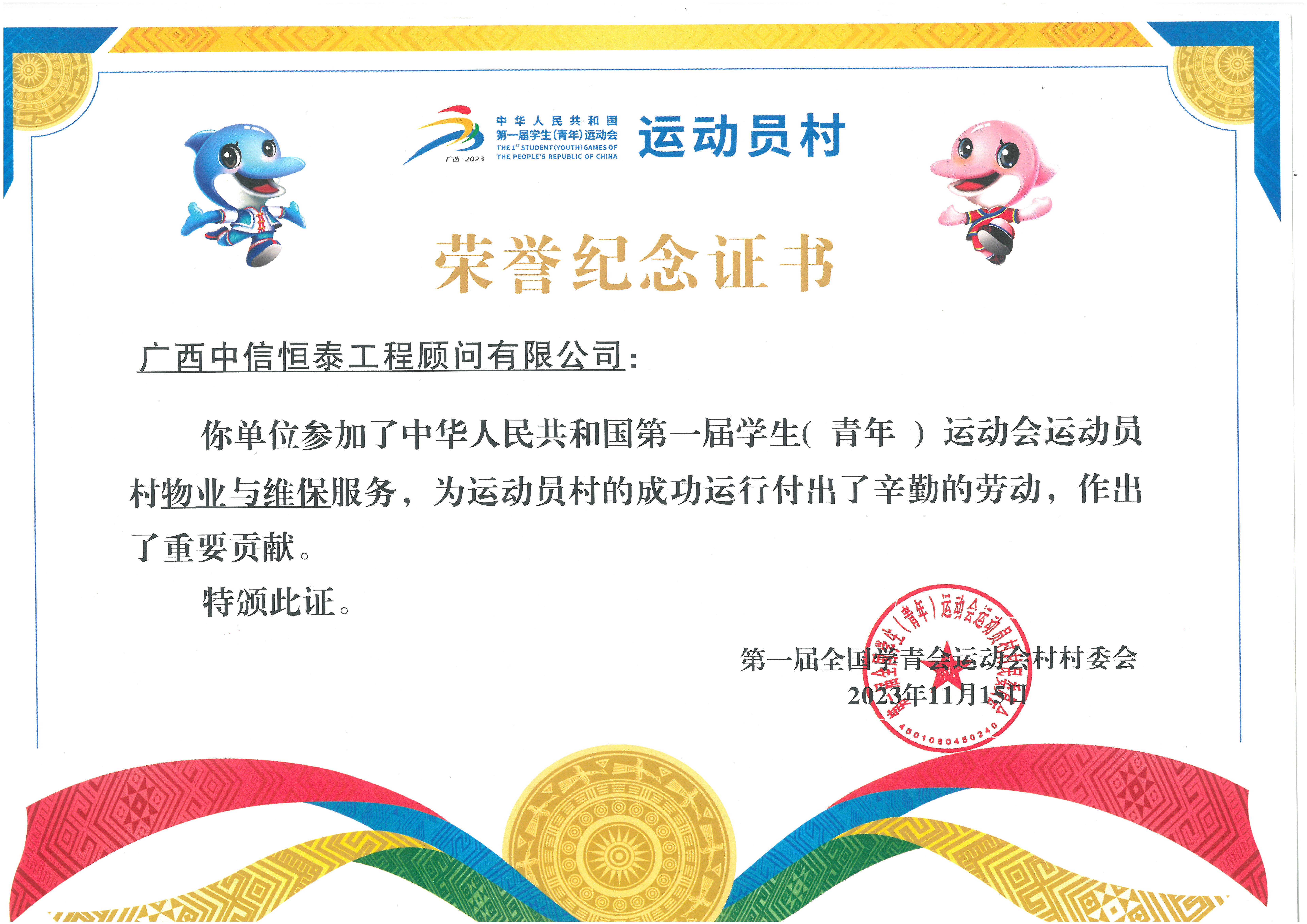 中華人民共和國第一屆學生(青年)運動會運動員村物業(yè)與維保服務榮譽證書