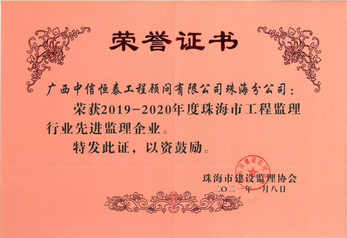 2019-2020年度珠海市工程監(jiān)理行業(yè)先進監(jiān)理企業(yè)