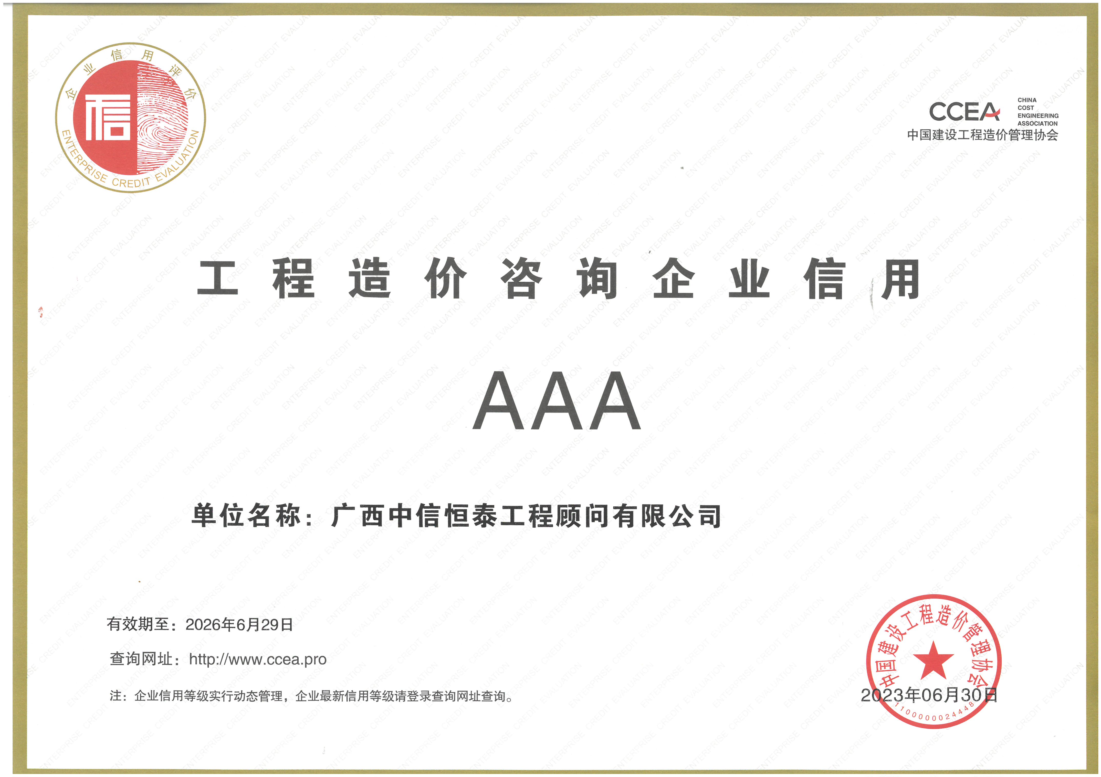 中國造價咨詢信用評價AAA等級證書2023-2026年