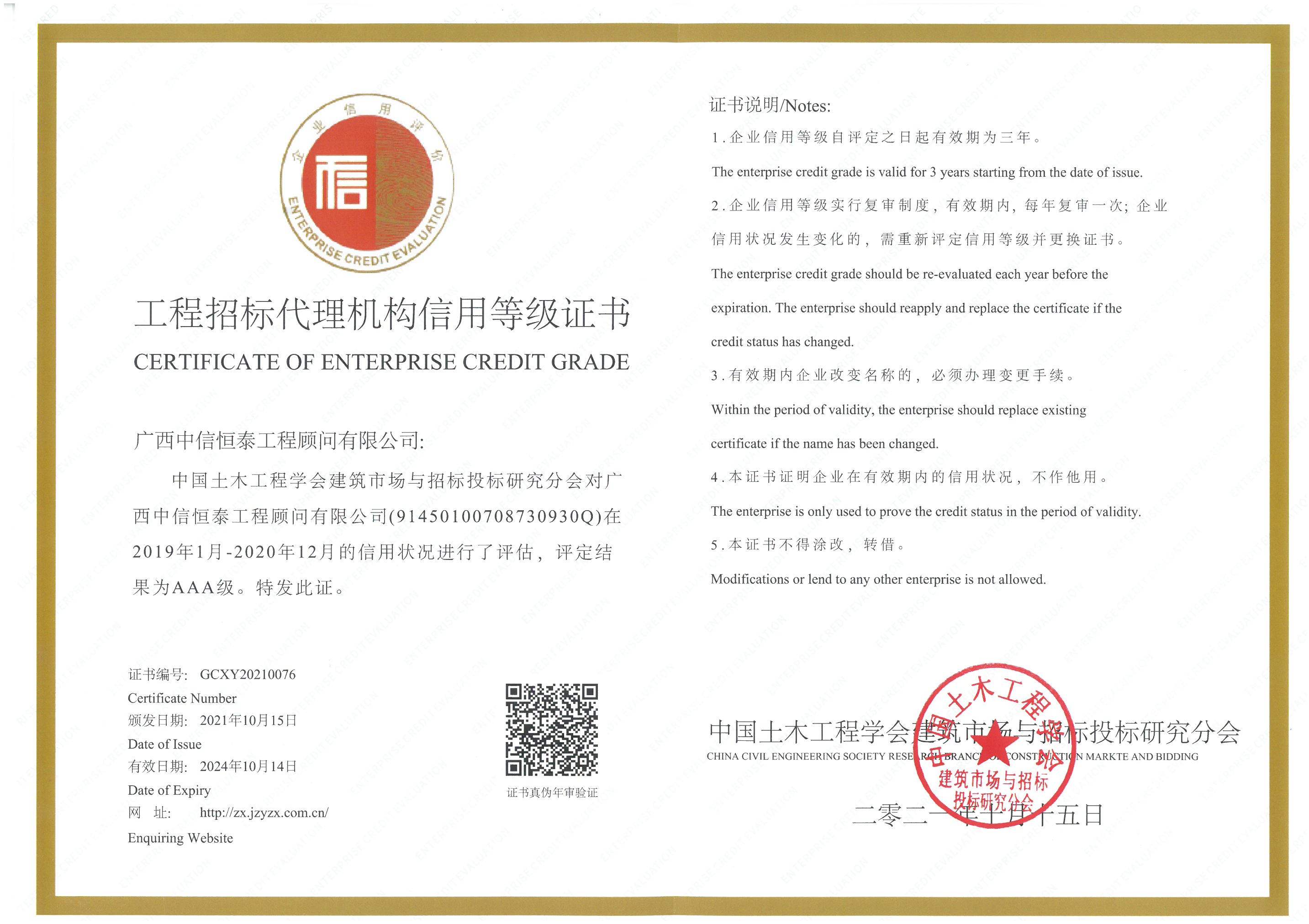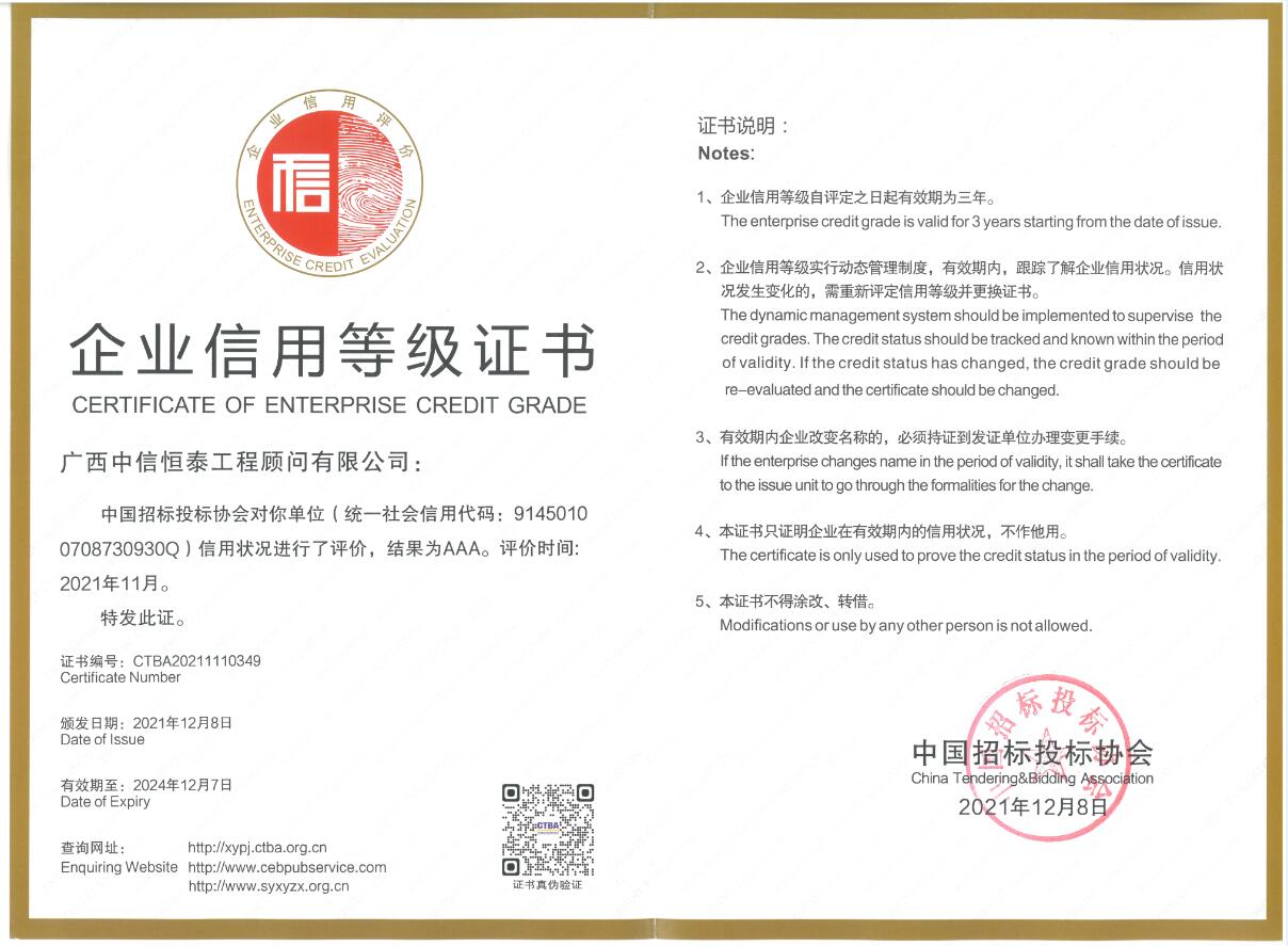 中國招標(biāo)投標(biāo)信用等級證書AAA2021-2024