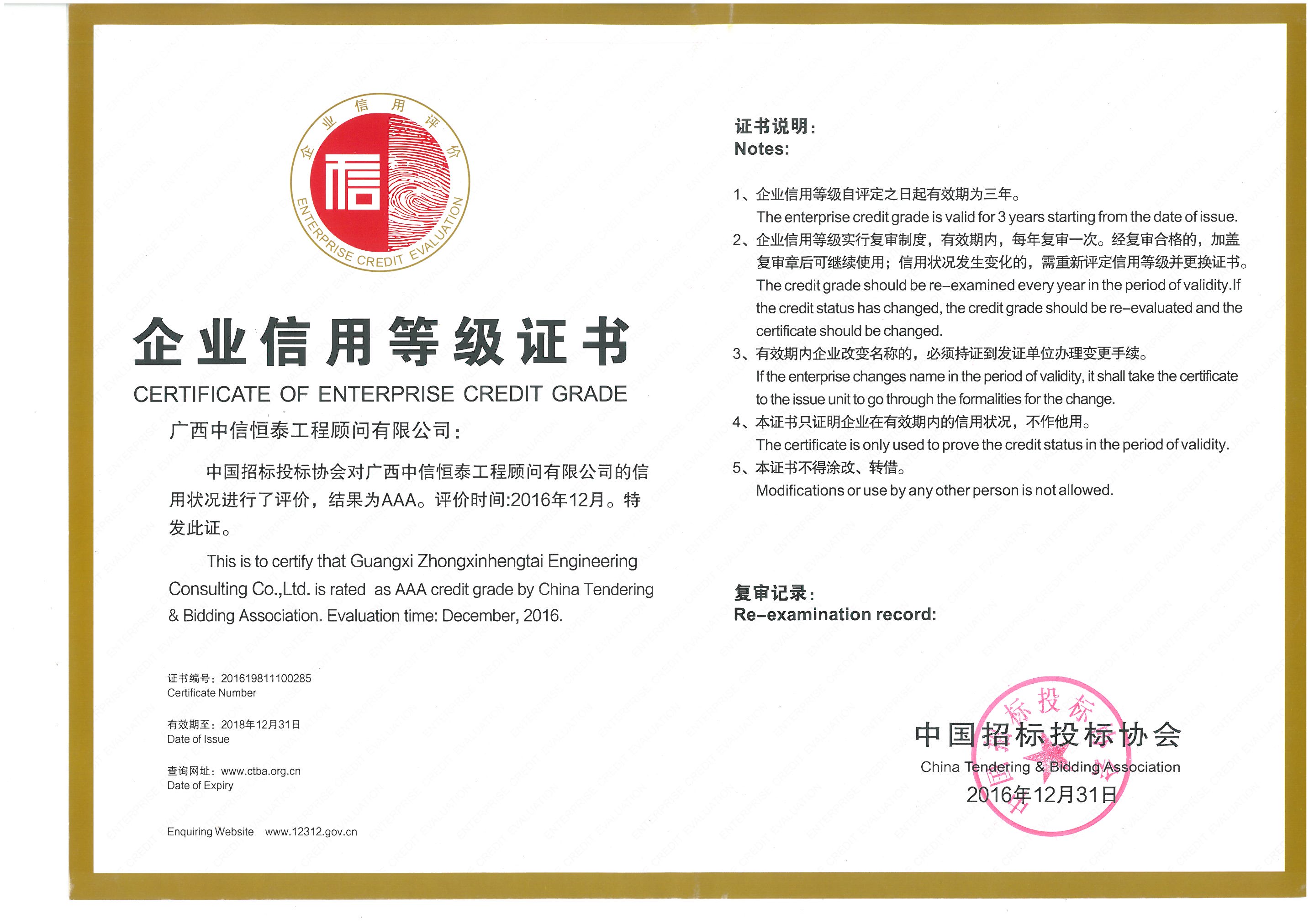 招標(biāo)代理企業(yè)信用AAA等級證書