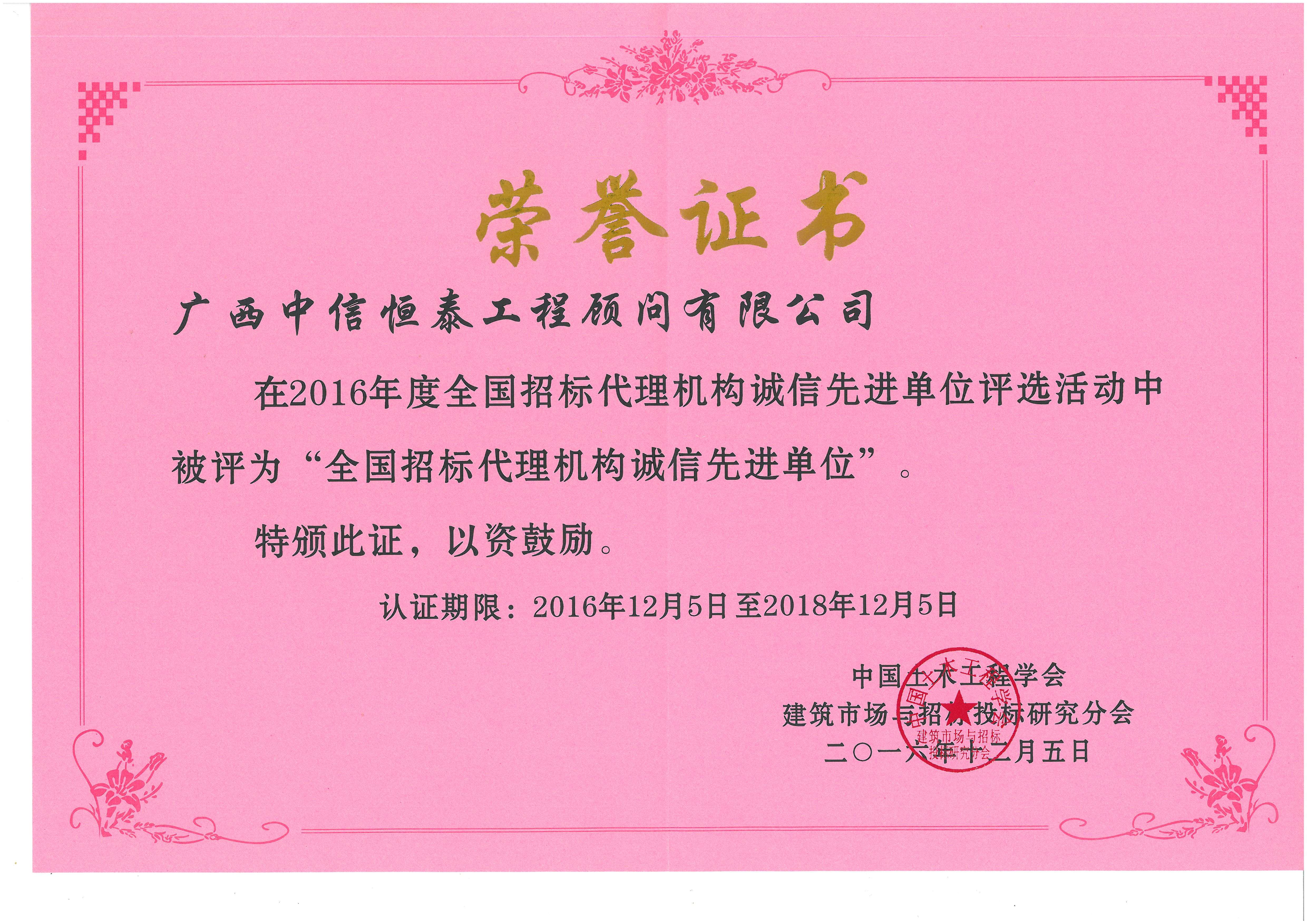 全國招標(biāo)代理機構(gòu)誠信先進單位