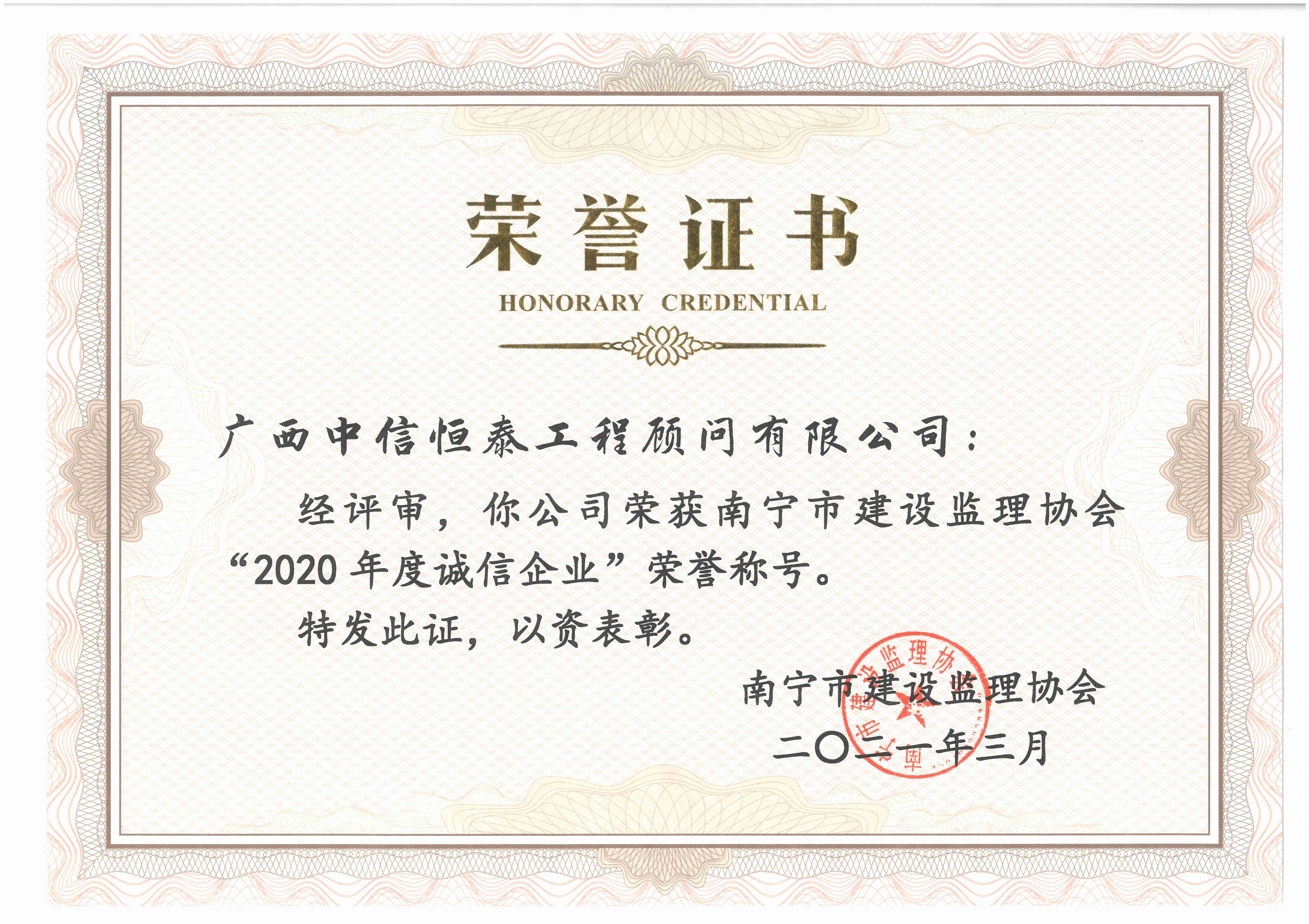 南寧市建設(shè)監(jiān)理協(xié)會“2020年度誠信企業(yè)”