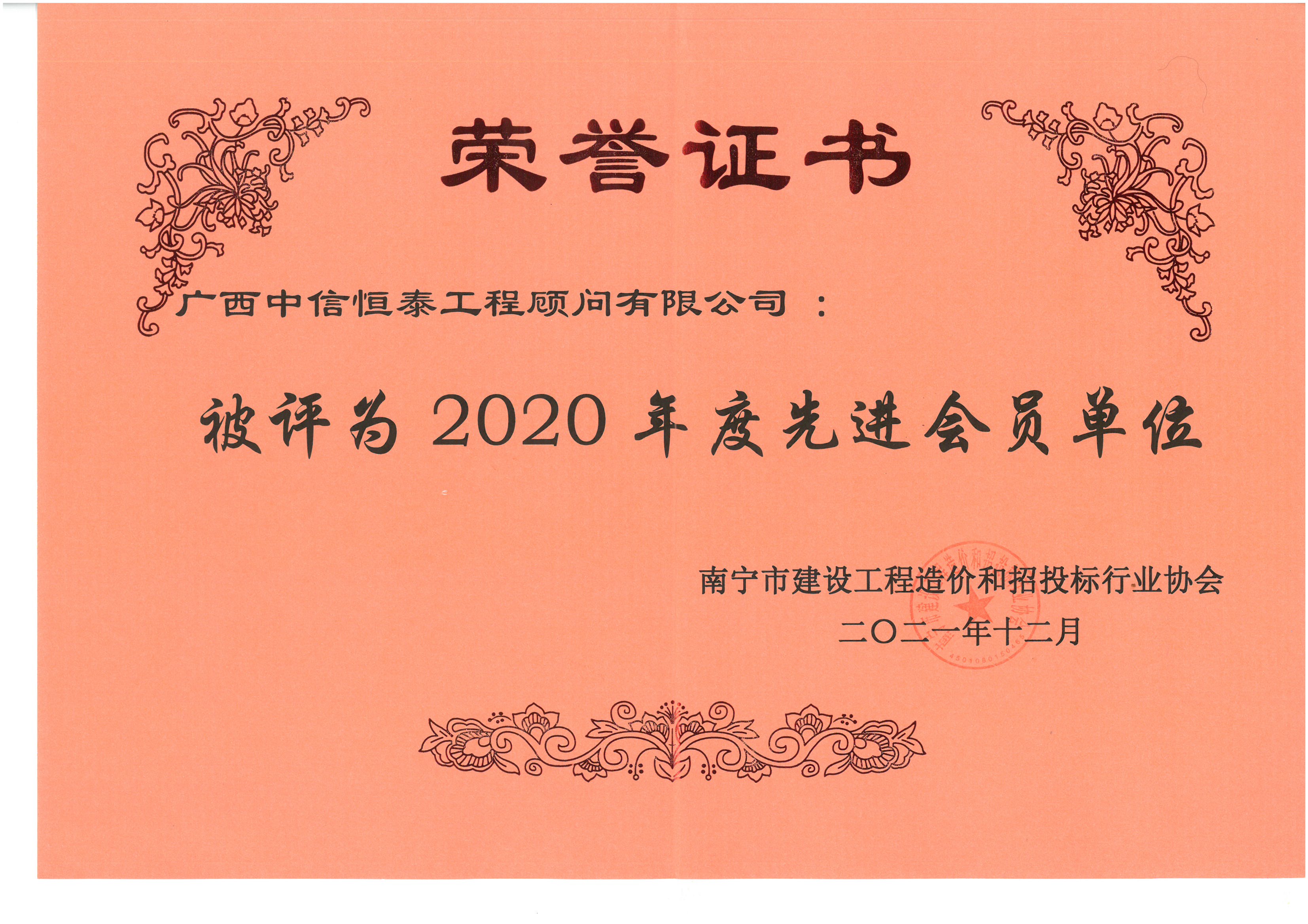 2020年度南寧市建設(shè)工程造價和招投標(biāo)行業(yè)協(xié)會先進會員單位